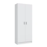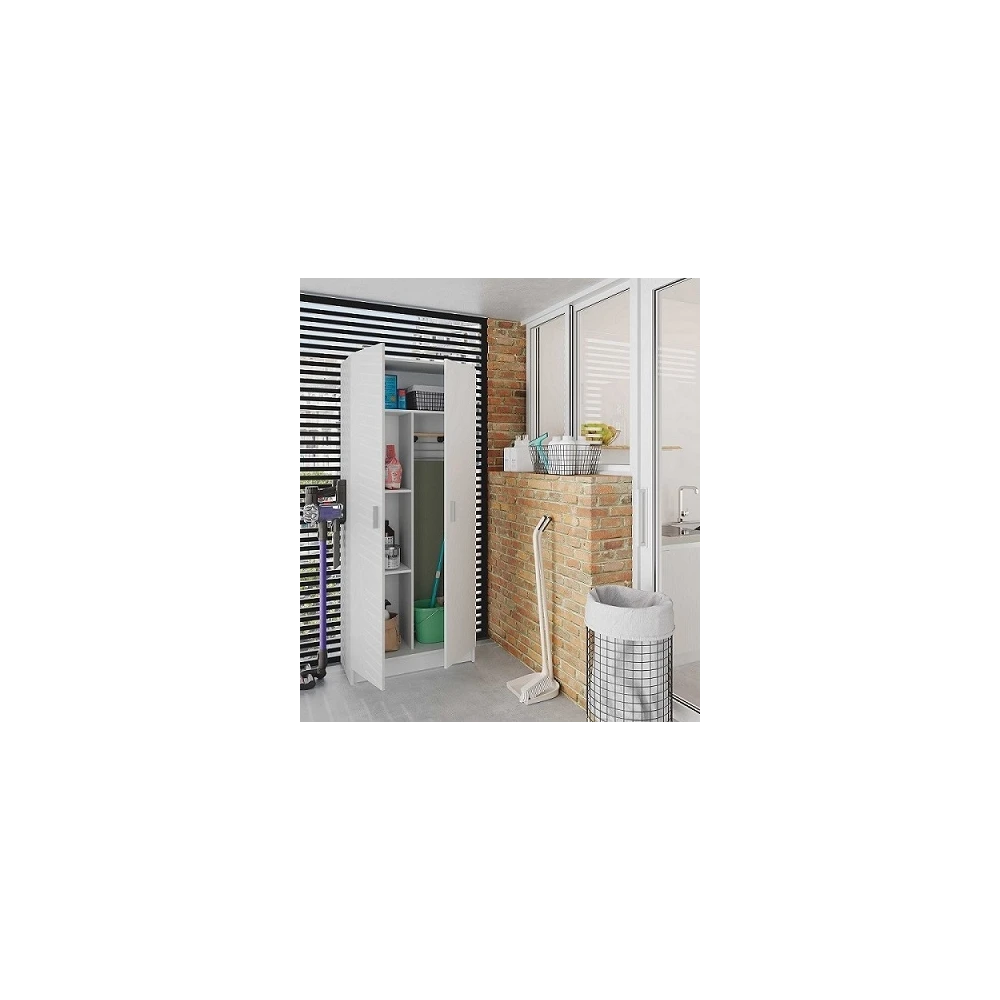 Superbe placard à balais avec 2 portes et un intérieur divisé en 3 zones : une avec 3 étagères, une sans étagères idéale pour les balais, serpillères et sceaux et une avec un compartiment supérieur.